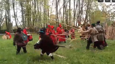 В солнечный майский день,наша скромная но не маленькая компания ,из Москвы, представлявшая впервые на наших 17-вечных мероприятиях клуб Форнит,прибыла под стены большой усадьбы Батурлиных-Зубовых и маленького безымянного монастыря возведенного для баталии во дворе усадьбы. Впервые для проекта Живых Уроков, наряду со школьниками Струнино и Александрова приехали приглашенные мной представители московского клуба Форнит и рязанского клуба "Железные Волки". | |
